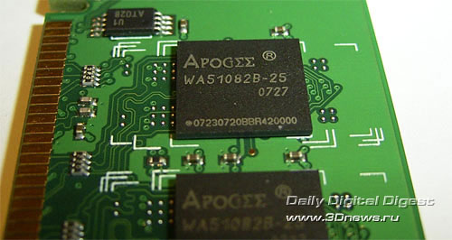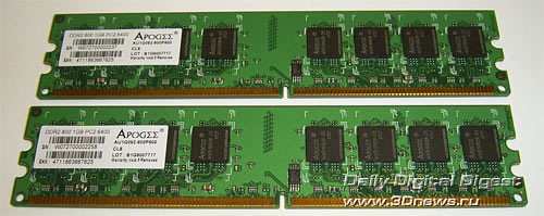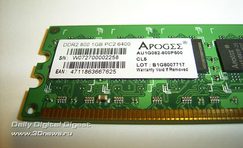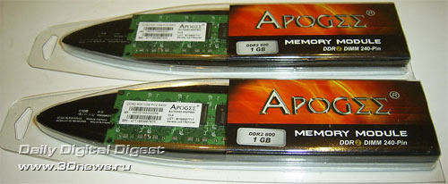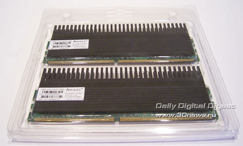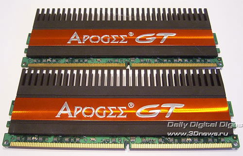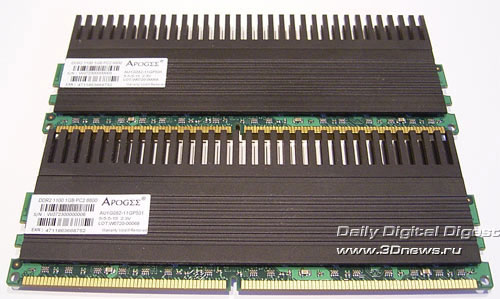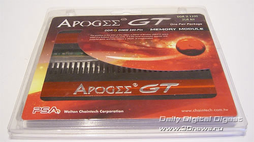 Ровно год назад мы протестировали два комплекта модулей памяти - DDR1 и DDR2 - производства компании Chaintech. Сегодня мы опять возвращаемся к продукции этой компании. Прежде всего, нас интересует насколько новые модули могут конкурировать с лучшими оверклокерскими продуктами. Первый комплект представляет собой модули обычного вида, которые предназначены для работы на частоте DDR2-800. Единственная интересная особенность - это упаковка в виде клинков: Объем модулей равен 1 Гб; микросхемы типа BGA. Как гласит наклейка на модулях, данная память способна работать на частоте 800 МГц; при этом рабочие тайминги не указаны. Впрочем, мы получим эту информацию из SPD: В общем, ничего выдающегося. Но теперь посмотрим на максимально возможную стабильную частоту, на которой способны работать эти модули. Для этого мы соберем систему на эталонной плате (это Gigabyte P35-DQ6 на чипсете Intel P35) и поднимем рабочее напряжение Vmem до 2,2 В.Отметим, что поскольку на чипах памяти нет радиаторов, то дальнейшее увеличение напряжения довольно опасно (особенно для длительной работы). Результат оказался вполне приличный - стабильная частота равна 1166 МГц. Но это при SPD-таймингах, а теперь определим максимальную частоту при низких таймингах (т.е. 4-4-4-12). Результат заметно ниже - только 874МГц (что, впрочем, и не удивительно). Переходим ко второму комплекту, который внешне значительно интереснее. Ничего не напоминает? Внешне модули Apogee GT очень, очень сильно похожи на модули Corsair Dominator! Впрочем, это только внешнее сходство. Реализация системы охлаждения Chaintech значительно проще и дешевле: на модулях Corsair Dominator радиаторы были связаны с PCB, которая также принимала участие в теплоотводе. Что касается модулей Apogee GT, то их радиатор состоит из двух частей: небольшой радиатор с одной стороны соединен с массивным радиатором, который установлен на другой стороне модуля и значительно выступает вверх. При этом радиатор выглядит как одно целое. Раскурочивать модули мы не решились, поэтому наиболее наглядная фотография получилась с такого ракурса: Наклейка на модулях говорит о возможности работы модулей на частоте 1100 МГц при таймингах 5-5-5-15 и напряжении 2,3 В: Что же, проверим! Но для начала посмотрим на информацию SPD: Непонятно! Утилита CPU-Z сообщает, что модули предназначены для работы на частоте 667 МГц. Впрочем, важно не это, а то, как эти модули покажут себя в работе. К сожалению, память Apogee GT никак себя не показала: стабильная частота = 1140 МГц при таймингах SPD и рекомендованном напряжении. Кстати, дальнейшее увеличение Vmem до 2,45 В не улучшило результаты, а привело к снижению стабильной частоты. Вполне возможно, это говорит о недостаточно хорошем контакте радиатора с одним или несколькими чипами памяти. Получается, что внешне навороченная память Apogee GT по максимальной частоте проиграла неказистой с виду памяти Apogee DDR2-800! Впрочем, на низких таймингах Apogee GT взяла реванш: стабильная частота = 950 МГц при таймингах 4-4-4-12. Итак, как интерпретировать полученные результаты: хороша память Apogee или нет? Для этого сведем все результаты в одну таблицу и подведем итоги: Конфигурация тестового стенда: Итак, модули Apogee DDR-800 показали вполне приличные результаты, и могут рассматриваться как альтернатива многим оверклокерским комплектам памяти. Но только по максимальной частоте! Как правило, модули, ориентированные на разгон, имеют